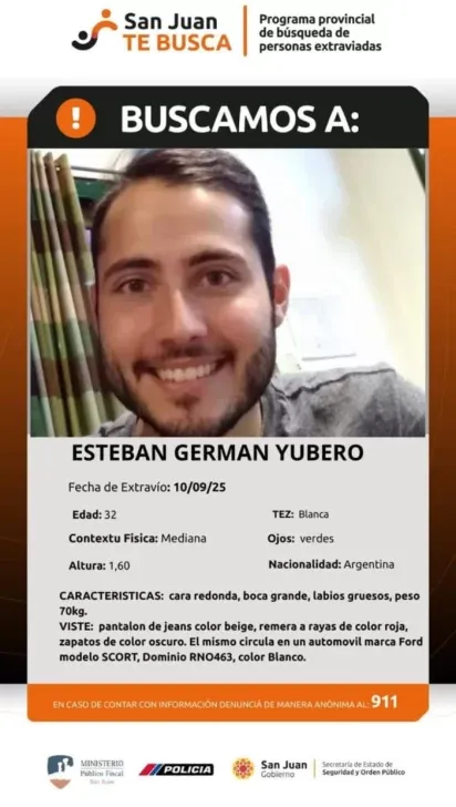 SAN JUAN – Las autoridades provinciales activaron el programa “San Juan te busca” para dar con el paradero de Esteban Germán Yubero, un hombre de 32 años que se encuentra desaparecido desde el miércoles 10 de septiembre.