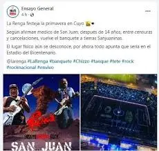 La publicación surgió de la página Ensayo General Rock, indicando: “según informan medios de San Juan, tras 14 años marcados por censuras y suspensiones, el banquete regresa a suelo sanjuanino”. Acompañando este texto, se adjuntó una imagen manipulada de los integrantes de La Renga con el paisaje del Valle de la Luna como fondo.